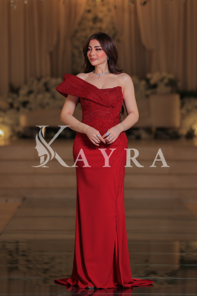 أناقة حمراء لا تُنسى! هذا الفستان الساحر هو تجسيد للجرأة والرقي. بتصميم فريد عند الصدر وتطريزات براقة تضفي لمسة من السحر، وقصة انسيابية تحدد القوام بأناقة فائقة. مثالي للمرأة التي تبحث عن إطلالة تعبر عن شخصيتها القوية وشغفها بالجمال. ارتديه لتكوني نجمة السهرة!