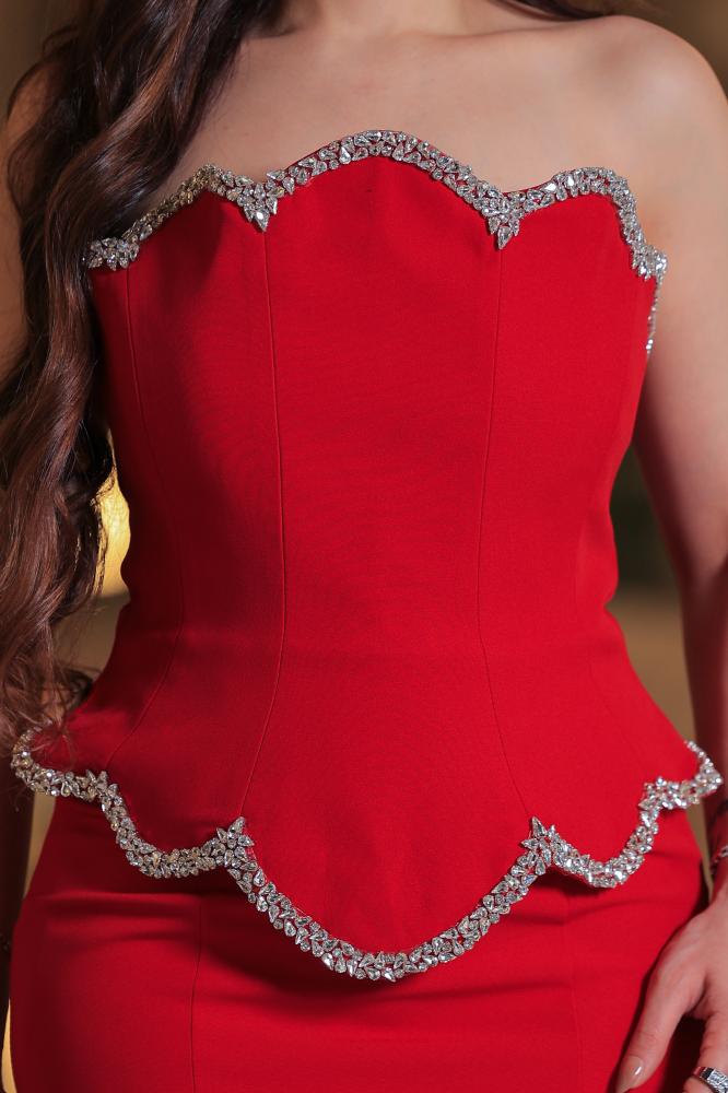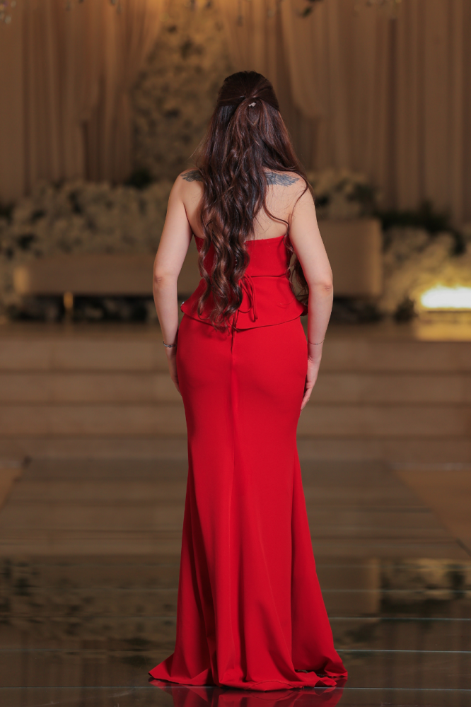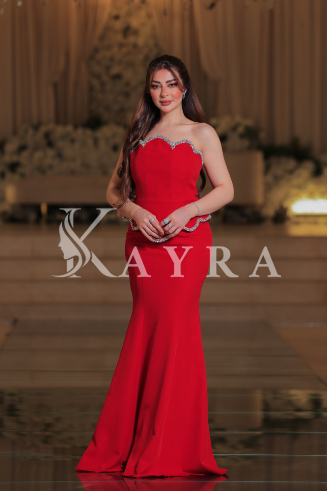 اخطفي الأنظار بفستان السهرة "روبي ريد" الأحمر القرمزي الساحر، بتصميم بدون حمالات وقصة صدر بشكل قلب. يتميز بتطريزات لامعة وفاخرة عند الصدر والخصر، مع قصة "بيبلوم" أنيقة وتنورة حورية البحر التي تحدد قوامكِ برشاقة. اختياركِ الأمثل لإطلالة جريئة وفاخرة في أي مناسبة خاصة.